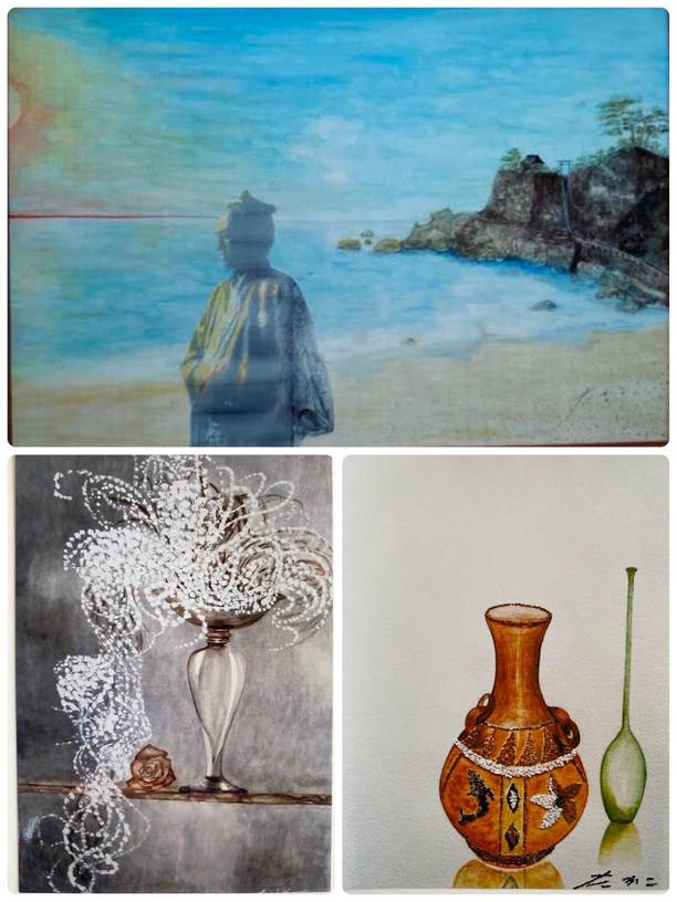 絵画も水彩、油彩、アクリル、パステル、和紙、部分的に卵の殻やビーズなどを使った作品など、